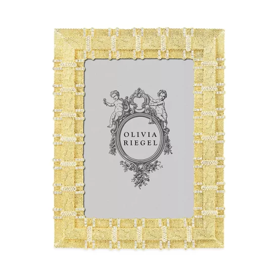 The Olivia Riegel Carlyle Frame features a gleaming border of gold-finished pewter that’s highlighted with hundreds of glittering hand-set Swarovski crystals.