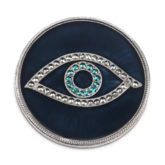 - Silver finished cast pewter coasters with blue guilloche-style hand enameling, accented with hand-set gray and light sapphire European crystals.