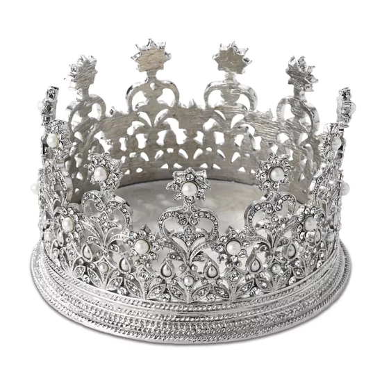 - A glorious pewter crown, embellished with hundreds of hand-set clear European crystals and faux pearls.