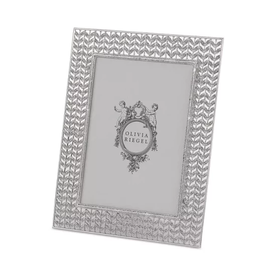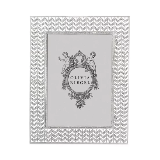 Displaying a contemporary silver-finished pewter filigree design encrusted with hand-set clear European crystals, the Stanton Picture Frame Collection by Olivia Riegel exudes elegance. Beveled glass further accentuates the beauty of each piece ,while gray moiré silk backs with easels allow for vertical or horizontal placement.