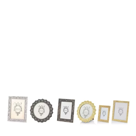Inspired by ornate estate jewelry, Olivia Riegel’s Windsor Frame Collection features designs hand set with sparkling European crystals. Elegant moiré silk backs have easels for vertical or horizontal placement.