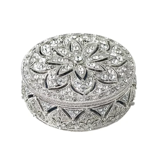 Dozens of hand-set clear Swarovski® crystals with a metal finish contain a hand-enameled interior.